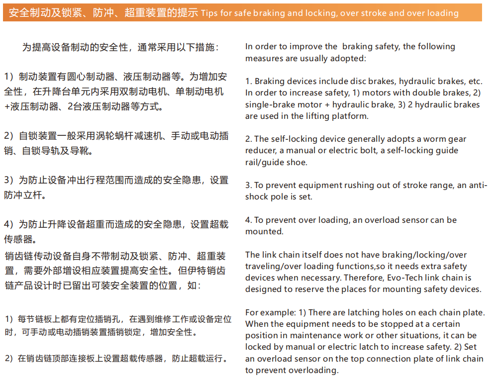 > 安全制动及锁紧、防冲、超重装置的提示
